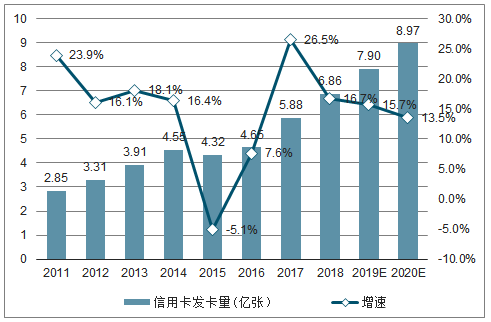 有統計數據顯示,自2007年國內信用卡髮卡增速達到80%的頂點之後,受金融危機及監管和審批加嚴的影響,增速放緩。2015年受互聯網金融衝擊,信用卡髮卡增速出現斷崖式下跌,之後,2017年開始執行的“信用卡新規”雖然對市場有一定刺激,帶來新一波爆發機會,但行業整體增長增速仍趨回緩。