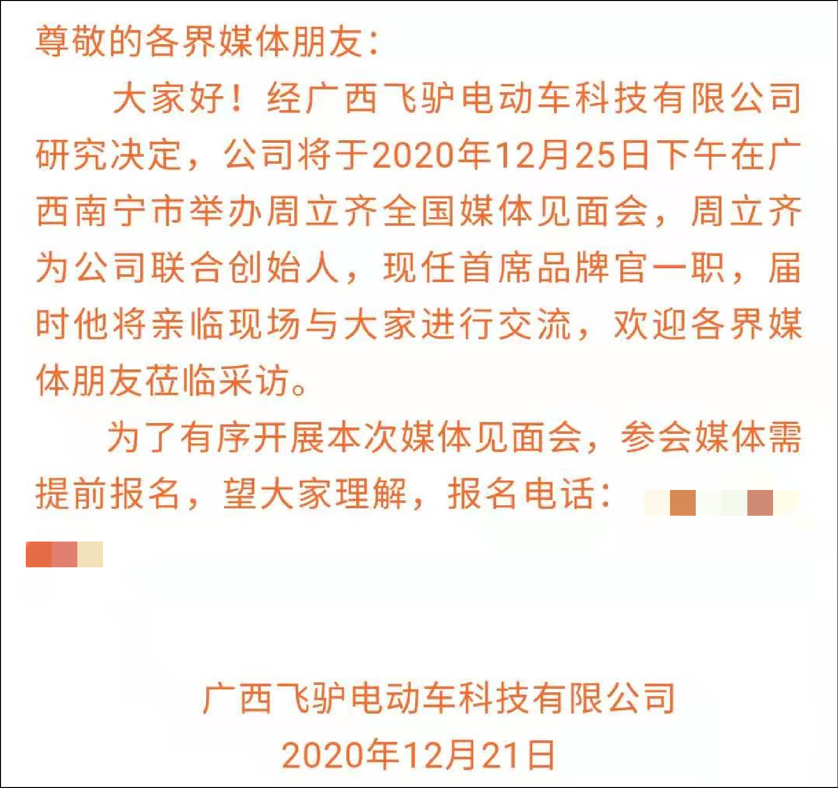 12月21日,廣西飛驢電動車科技有限公司公眾號“飛驢科技”發文表示,周立齊已正式出任公司首席品牌官一職。