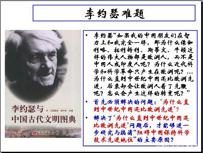 “李約瑟難題”,問的是為什麼十七世紀以來,即清朝以來,中國漸漸“落後”而歐洲卻疾速“進步”?