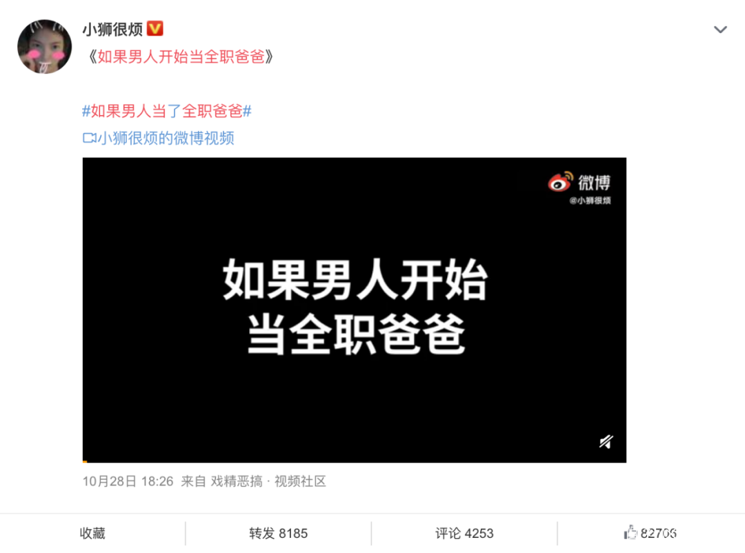圍繞#張桂梅校長反對當全職太太# 的話題,@小獅很煩 在微博上發起並主持了話題#如果男人當了全職爸爸#,和@小水馬c 一起製作《如果男人開始當全職爸爸,最後亮了》的視頻,在微博上引發了深度討論,話題閲讀量高達7192萬,視頻播放量達到304萬,並登頂當日的搞笑幽默榜。