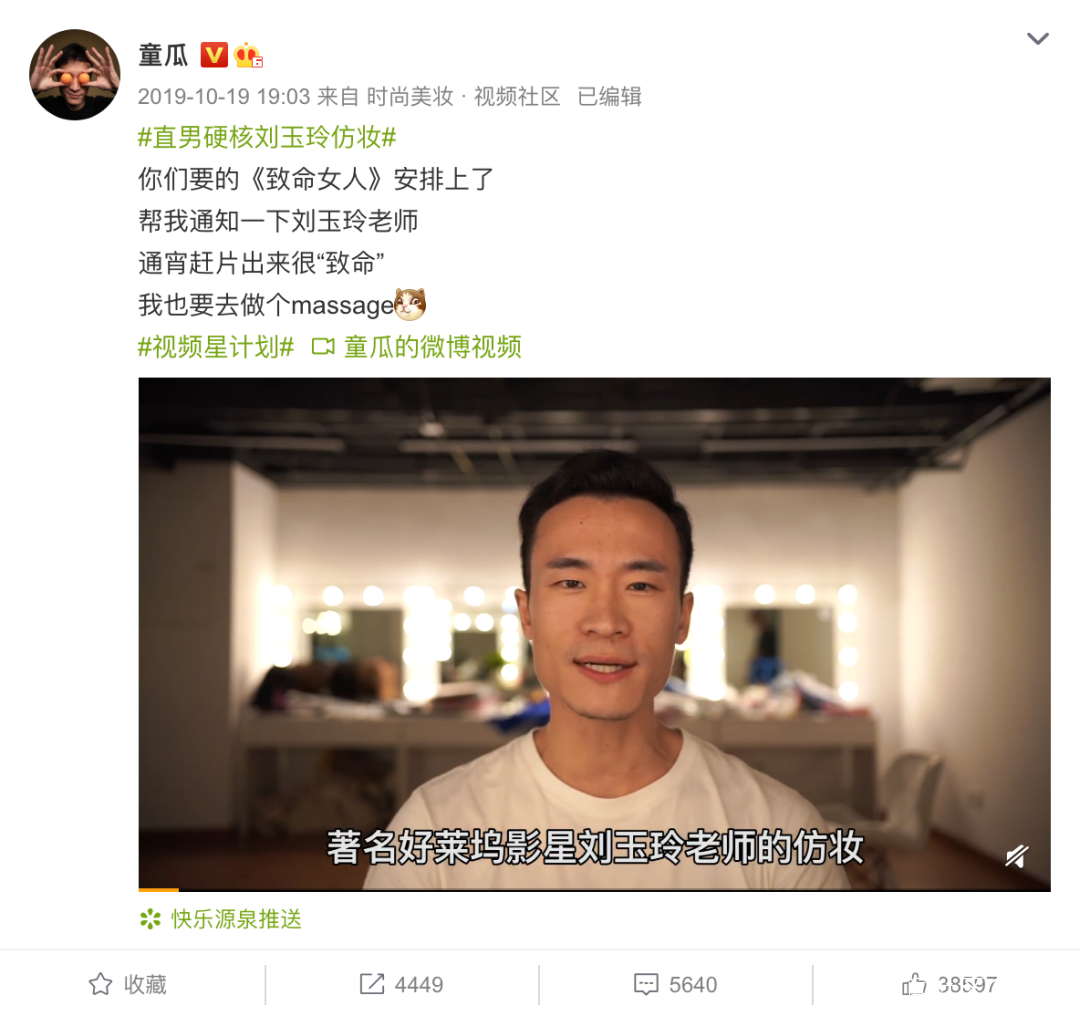 @童瓜 在2019年初正式開通微博,前幾期的內容並未引起太大的反響,但在《致命女人》熱播時經常有粉絲給@童瓜 留言説他長得像劉玉玲,於是他就萌生了做一期模仿影視片段內容的想法。最終《直男硬核劉玉玲仿妝》以強烈的反差感收穫了263萬播放量,也是@童瓜 第一條登上微博熱搜的內容。