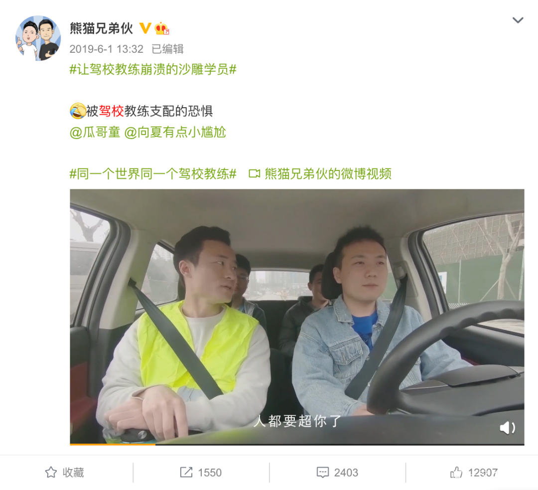 比如結合年輕人學車的話題,@向夏 和@童瓜 分別扮演學員和教練,製作了《駕校學車時的你》,將駕校教練的碎碎念和學員的緊張感詮釋的淋漓盡致,吸引了數千網友在微博下留言吐槽,累計播放量高達880萬。