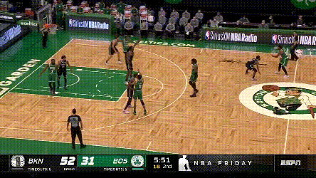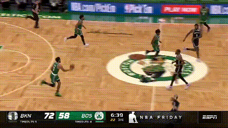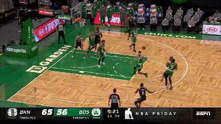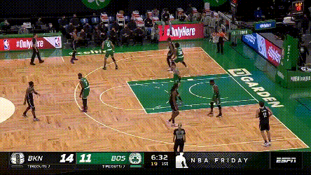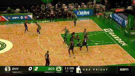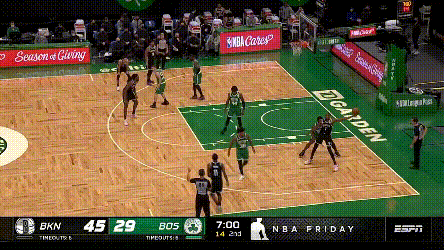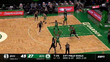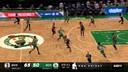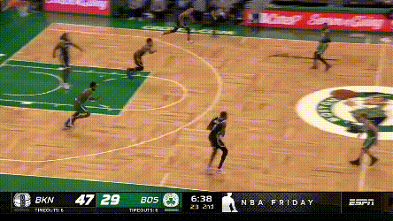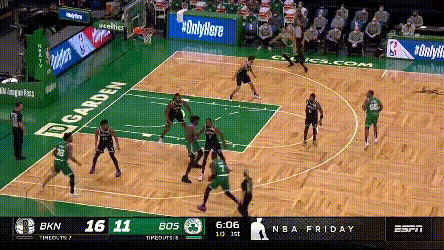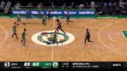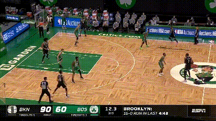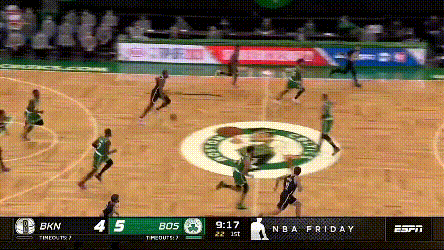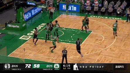 2. 同時弱側塔圖姆招手示意杰倫布朗掛一個掩護跑錯位,同側的杜蘭特與丁威迪選擇換防。