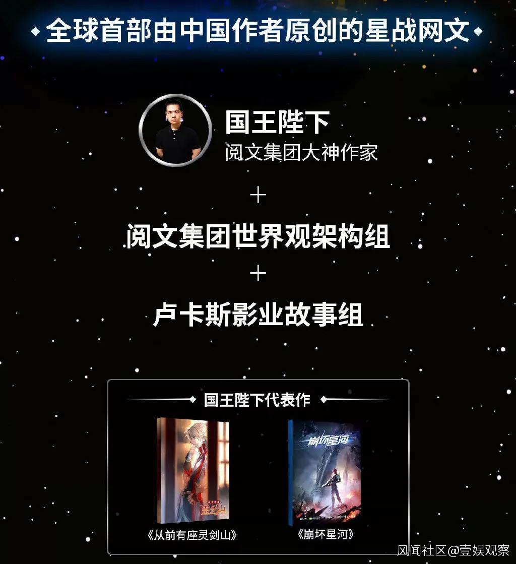 此次負責執筆的閲文大神作家國王陛下,其本人也是星戰資深粉絲,並且擅長用二次元方式表達當代年輕人對於世界的理解,其代表作《從前有座靈劍山》、《崩壞星河》擁有大量忠實讀者。