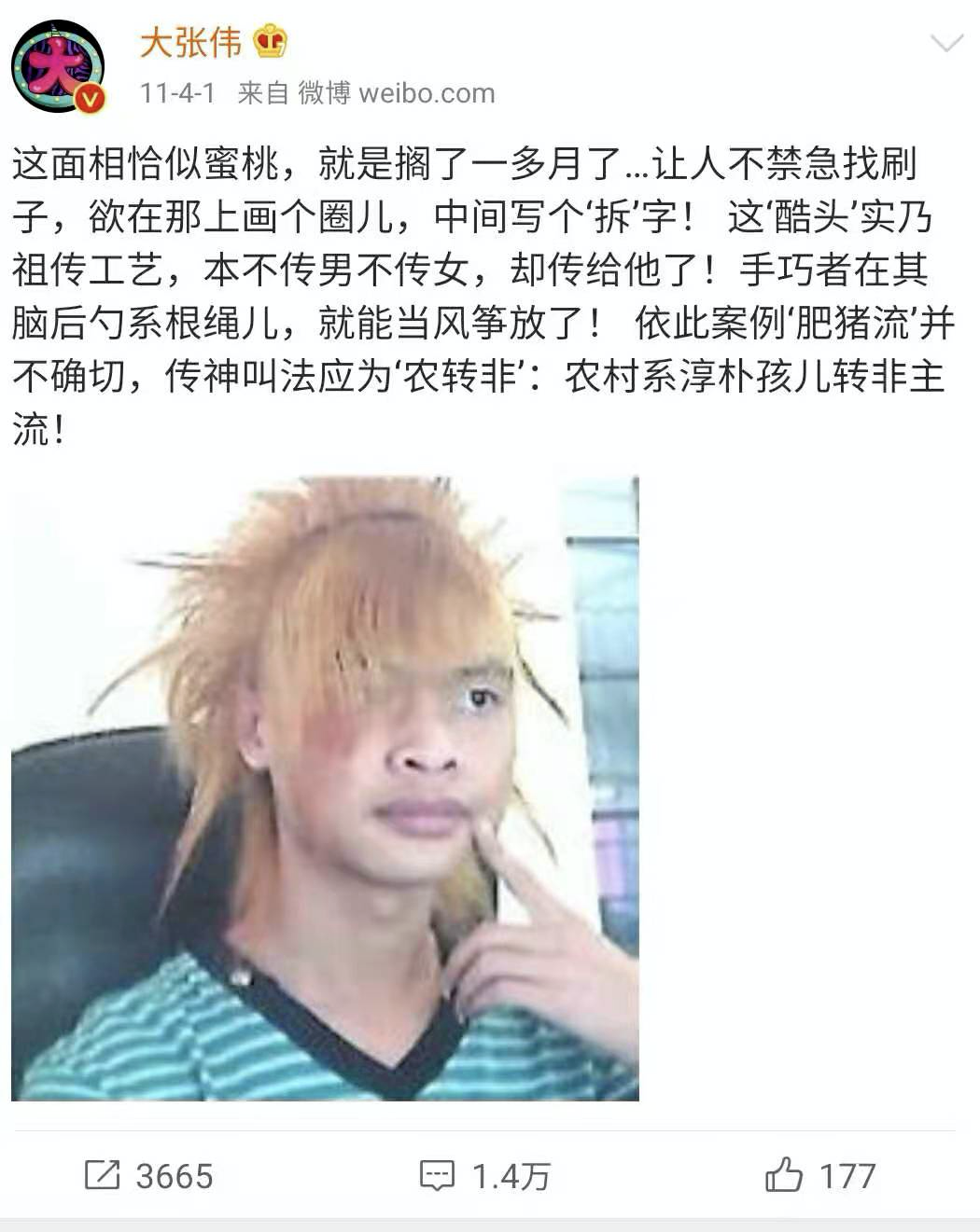 2011年,出道時曾作視覺系裝扮的花兒樂隊原主唱,在微博上傳了一張“殺馬特”造型圖片,並揶揄其為“農轉非”——農村孩子轉非主流 (“農轉非”原指城市化後農村户口遷出,因而這一説法帶有雙重惡意) 。