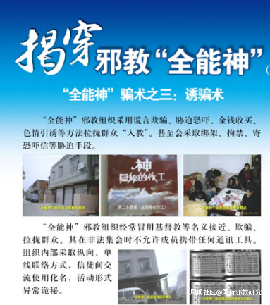 火災現場照片 2011年12月13日,在吉林省白城市經濟開發區一居民樓的樓道內發生一起火災,居住在該單元的居民郭鳳榮、卞靜和張秀清三人在—樓樓道間內死亡。經公安和消防部門現場勘查、調查和屍檢,認定三人均為煙塵氣體造成窒息死亡,郭鳳榮屍體炭化損毀程度嚴重,手腳及四肢部分燒燬,腸子溢出,確定該人是起火點,當時身上有可燃物。在卞靜身上攜帶的揹包中發現“全能神”邪教書籍《話在肉身中顯現》一本。 案例七:湖北棗陽“全能神”信徒靳麗娟為“昇天”割頸自殺 2004年11月9日,湖北省棗陽的“全能神”信徒靳麗娟在外聽完禱告回來後,從家裏拿起菜刀跑到門前200米的山坡,對丈夫説:“我聽到主的召喚了,主讓我現在就去!”在求丈夫孩子助其“昇天”無果的情況下,她自己拿起刀毫不猶豫地往頸部氣管一割,當即噴血昏迷。丈夫趕忙將其送往棗陽市一醫院進行搶救,經過醫生的及時搶救,靳麗娟總算醒了過來,可她還是堅持不打針吃藥,並執意回家。無奈之下丈夫只好帶她回家,沒過幾天,靳麗娟病情迅速惡化,終因感染併發症離開了人世。 案例八:湖南長沙“全能神”信徒謝云為“昇天”喝農藥自殺 湖南省長沙市嶽麓區人謝雲痴迷“全能神”,放棄了任何親情友情,時常期盼着“靈魂昇天”,並宣稱“世界末日到了,我與天堂近了”。2003年初秋的一天中午,謝雲被人發現倒在廚房門前的石墩上,已奄奄一息,身邊還有一個空的農藥瓶。由於農藥飲用過多,謝雲雖然被送往縣醫院搶救,卻於次日凌晨2時離開人世。