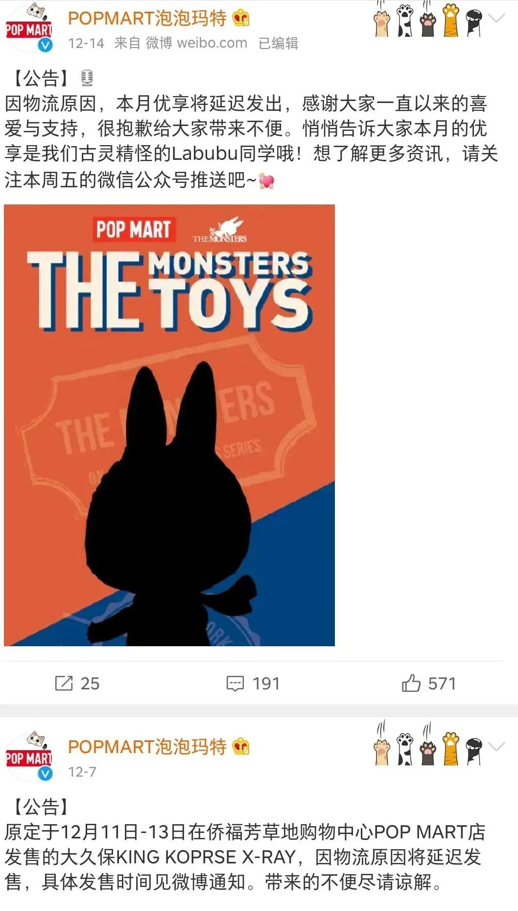 圖 / 泡泡瑪特官方微博宣佈延遲發售