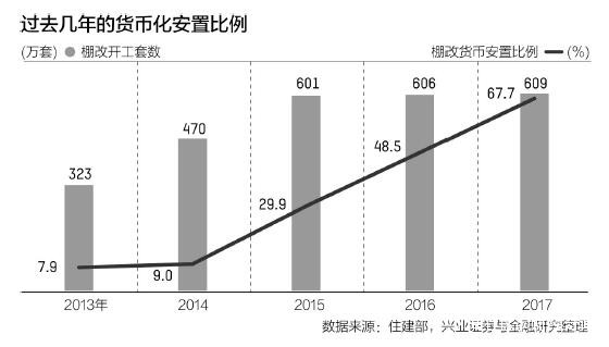 於是,我們看到了棚户區改造規模快速翻倍,拆除舊房子,供給質量更好的新房子。棚改中貨幣化安置比例也迅速提高,形成新需求。