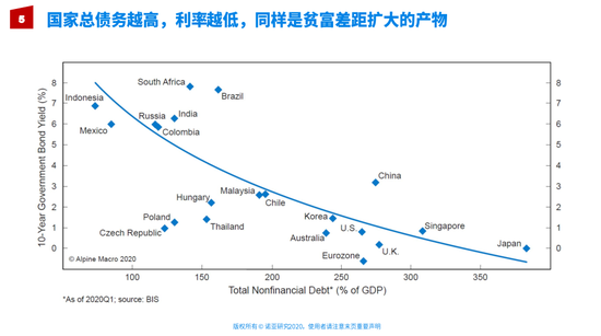 每一次危機到來,美國都進行了大量放水,經濟活力卻不斷下滑。原本,一個經濟主體負債越高,風險就越大,那麼它發行新債務的利率就應該越高,但是各國的國債利率恰恰相反,債務越大的國家利率越低。這説明政府印出來的錢,更多地被儲蓄起來,而不是轉化成有效需求。