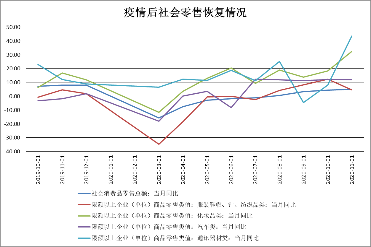 汽車、通訊器材、化妝品等高端消費恢復速度,明顯跑贏社會總體消費 數據來源:國家統計局