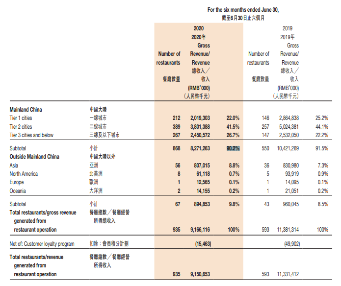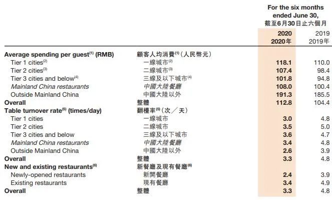 上半年的平均翻枱率,從去年同期的4.8次/天減少到3.3次/天。同店平均日銷售額,一二三線城市都出現了較大幅度的下滑。其中下滑最明顯的是一線城市,從13.38萬元,下降到9.73萬元。