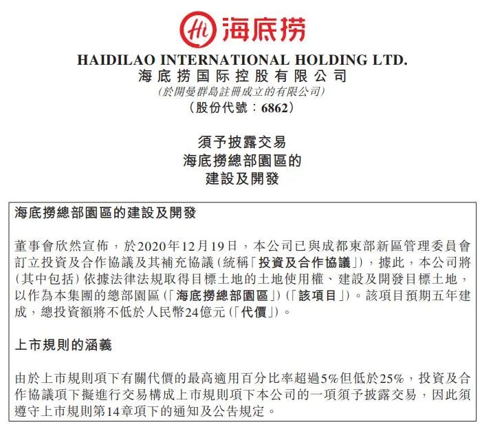 公司已於2020年12月19日,與成都東部新區管理委員會訂立投資及合作協議及其補充協議,公司將依據法律法規取得目標土地的土地使用權、建設及開發目標土地,以作為集團的總部園區(海底撈總部園區)。該項目預期五年建成,總投資額將不低於人民幣24億元。