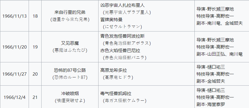 由於劇集數量很多,円谷英二往往會讓許多不同的導演負責不同劇集的拍攝,同時每一集的劇本也都是不同的編劇寫的。