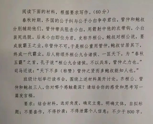 去年,全國高考作文因選題獨特,引起熱議。作文要求考生通過齊桓公(即公子小白)、管仲、鮑叔牙的一則歷史故事,寫出自己的感觸。題目的原文是這樣的:春秋時期,齊國的公子糾與公子小白爭奪君位,管仲和鮑叔分別輔佐他們。管仲帶兵阻擊小白,用箭射中他的衣帶鈎,小白裝死逃脱。後來小白即位為君,史稱齊桓公。鮑叔對桓公説,要想成就霸王之業,非管仲不可。於是桓公重用管仲,鮑叔甘居其下,終成一代霸業。後人稱頌齊桓公九合諸侯、一匡天下,為“春秋五霸”之首。孔子説:“桓公九合諸侯,不以兵車,管仲之力也。”司馬遷説:“天下不多(稱讚)管仲之賢而多鮑叔能知人也。”