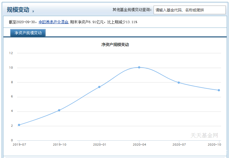 據天天基金網,2020年3月31日至2020年9月30日,中歐養老產業混合的基金規模出現了下滑,由10.06億元降為6.91億元,降幅高達31.31%。
