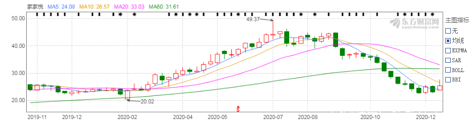家家悦股價在2020年7月3日最高達49.37元/股,截至2020年12月18日收盤,報25.27元/股,幾近“腰斬”。