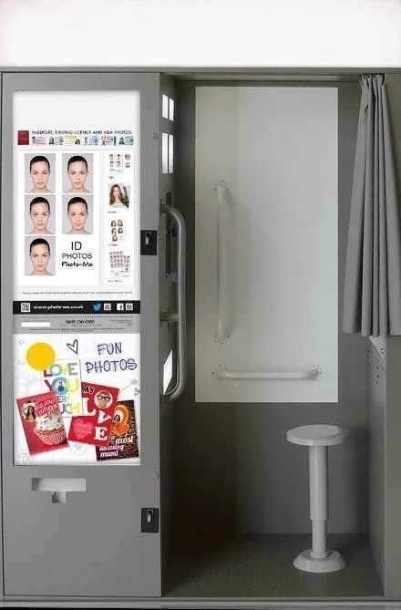 其中一個例子用到了這種即時照相亭,它 可以很方便地拍護照照片。它的使用方法是坐進去選擇好照片尺寸,然後點擊拍照,等五分鐘就可以取到照片了。