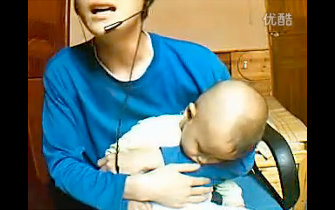 你看這個嬰兒的父親唱得聲嘶力 竭, 他的孩子可沒那麼興奮,在他的懷裏睡着了。
