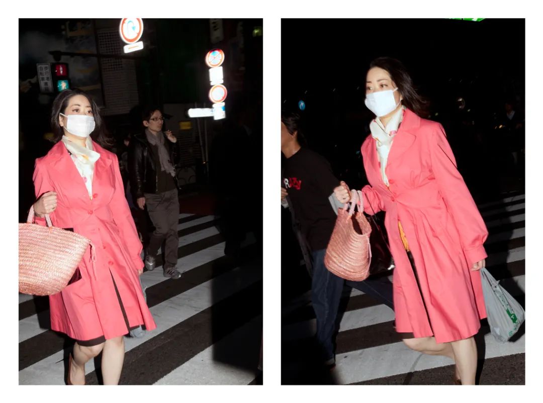 我當時是和我的朋友一起去的,他也拍了這位女士。還是穿着那件粉色大衣,戴着口罩,拎着粉色的包,不過在他的照片裏,你可以看到她還拎着另一個灰色的袋子。這在我拍的那張照片裏是看不到的。