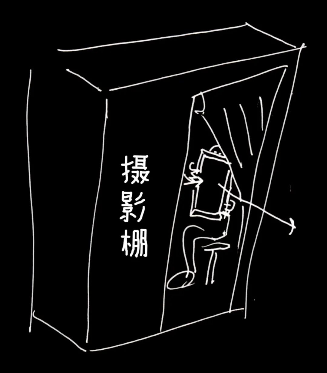 這是一種非常侷限的攝影方式,不過也正是我喜歡它的地方。於是我拿着一面鏡子坐在了這個照相亭裏,然後把鏡子傾斜了45度,大概像這樣: