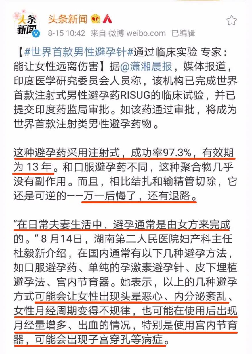 2019年7月,一條“男性避孕藥將在5年內面世”的消息,在微博炸開了。