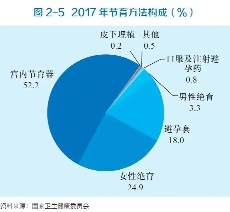 正在避孕的夫妻中,52.2%的女性使用了宮內節育器,24.9%的女性做了絕育手術,而男性做絕育手術的,只有3.3%。