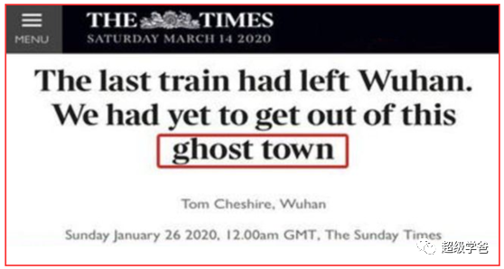 英國《泰晤士報》直接把武漢稱作了鬼城:《病毒爆發,武漢成了一座鬼城,我們被拋棄了》《最後一趟火車離開,我們還沒有離開這座鬼城》。