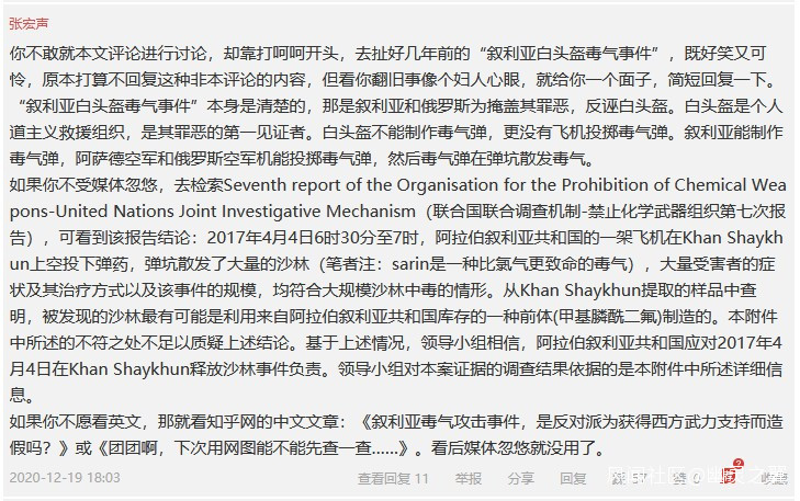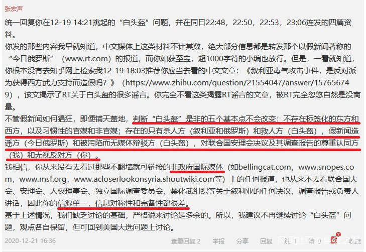 本例中@張宏聲 的回覆,毫無疑問,他駁斥了所有認為“白頭盔”不是好人的回覆,同時也強調了他的觀點: