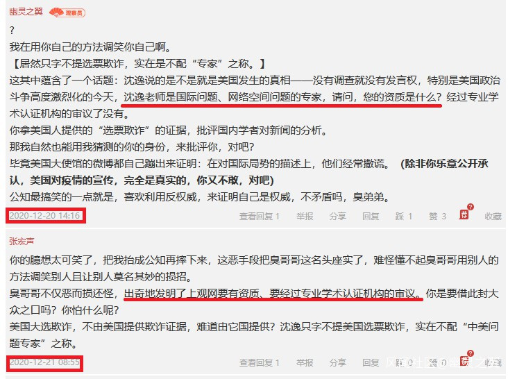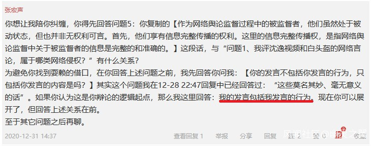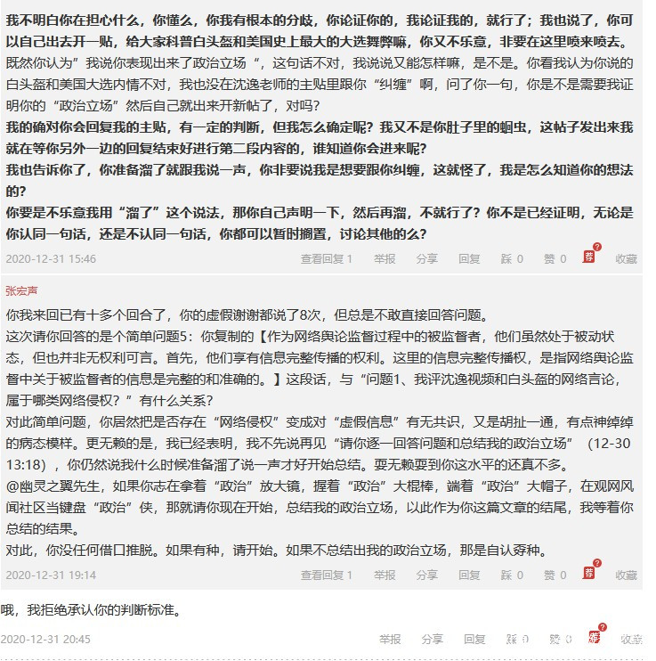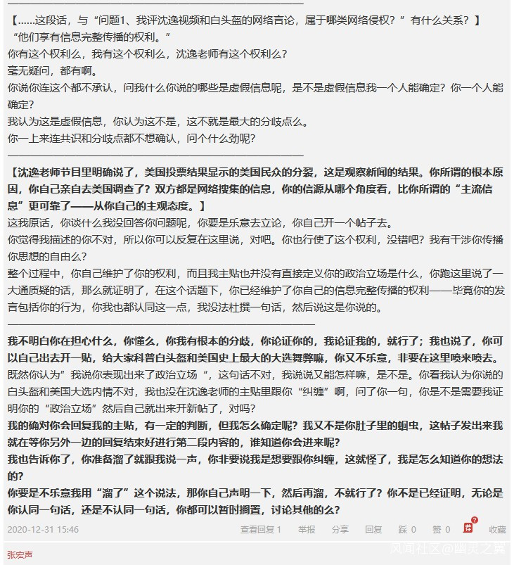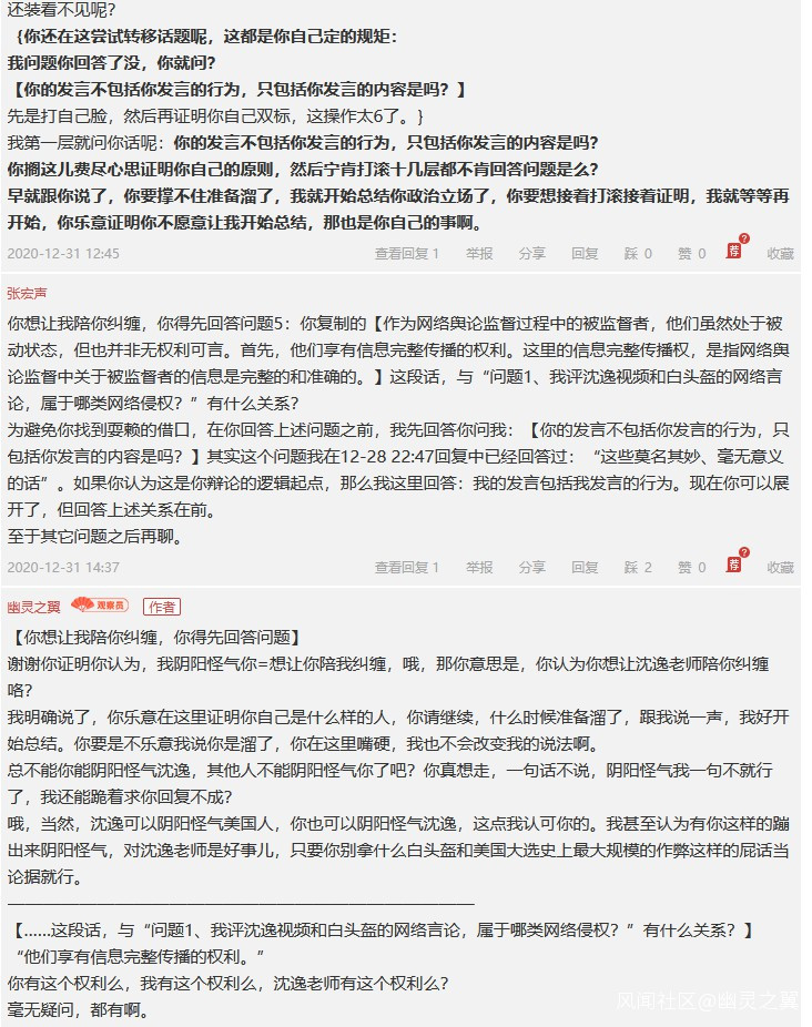 在本帖原檔中的回覆,也表明,對其他人的反覆質疑,他認為是“糾纏”,而對自己反覆在沈逸原貼下質疑的行為,絕口不談