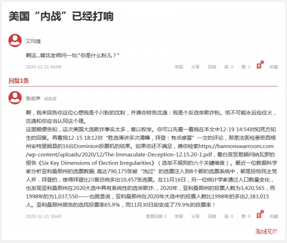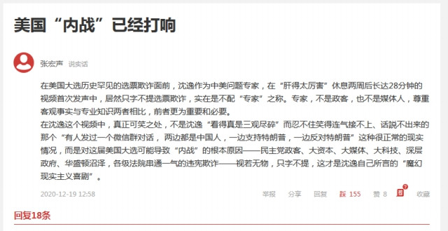 兩邊都是中國人,一邊支持特朗普,一邊反對特朗普”這種很正常的現實情況,而是對這屆美國大選可能導致“內戰”的根本原因——民主黨政客、大資本、大媒體、大科技、深層政府、華盛頓沼澤,各級法院串通一氣的違憲欺詐——視若無物,隻字不提,這才是沈逸自己所言的“魔幻現實主義喜劇”。