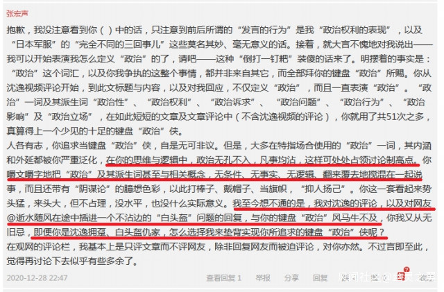 @張宏聲 自認為政治與他無關雖然,然後在後續回覆中承認言論自由是政治權利,網絡發帖包括髮帖的行為,雖然從直觀感受上講,@張宏聲 表現出了個人主義,但仍有必要謹慎的論證。