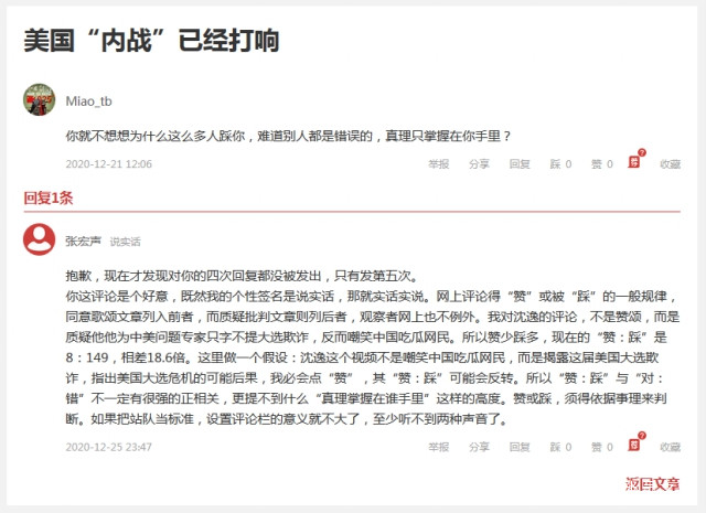 文章的最後,讓我們回到本文想要批評的目標,在對沈逸老師是否滿足“學者”這一稱號(或者乾脆點,要不要在看美帝笑話的時候在節目裏笑,增加節目效果)這一爭論點的爭議中,@張宏聲 通過堅持“我是個反選舉欺詐粉。紙不可能永遠包住火,沈逸和你應當認同這個理。”的觀點,來消解沈逸在貫穿今年的疫情期間多次發表視頻評論建立起的公信力,並通過,