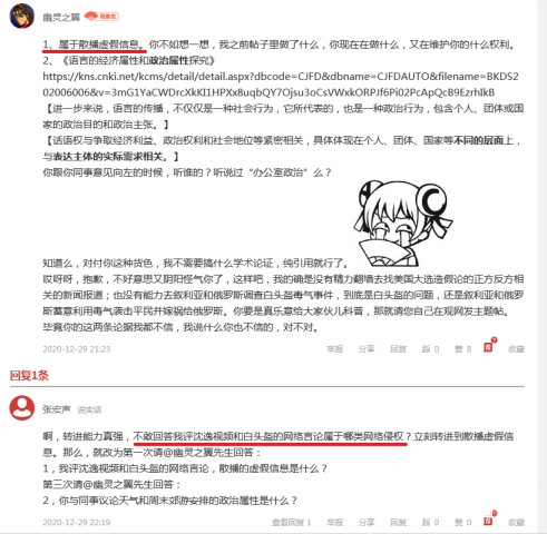 一個基本事實是,無論是我國學者還是普通網民都沒有親自參與調查,理想狀態是正反雙方各持觀點並表露出來,在下一步的傳播鏈中,與原始信息一起供信宿參考(網狀的傳播關係中,每個人又都提供給其他人蔘考觀點)。對不特定的回覆均持壓制態度,表明他“不是在針對誰”。