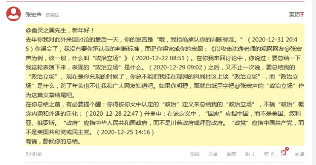 那麼,輪到@張宏聲了,我挺好奇,他是要從否定自己言論有“政治性”開始,還是要從我的觀點不對入手。