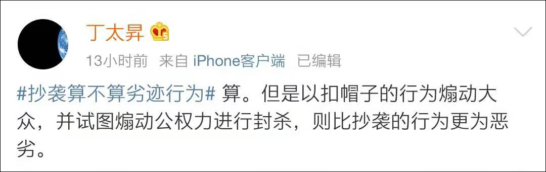 “以扣帽子的行為煽動大眾,並試圖煽動公權力進行封殺,比抄襲的行為更惡劣。”丁太升的言論獲得了一眾網友的支持。