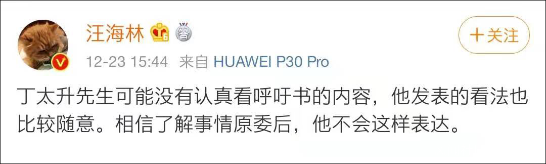 23日下午15:44,汪海林發佈微博稱,“丁太升先生可能沒有認真看呼籲書的內容,他發表的看法比較隨意。”