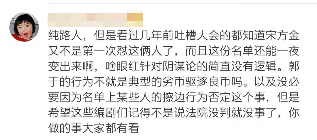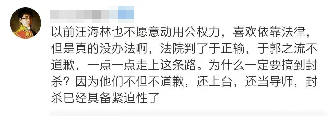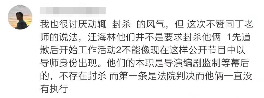 還有網友指出,汪海林、宋方金並非是要封殺郭敬明和於正,而是要求兩人先道歉方可開始工作活動,並且不能在公開節目中以導師這類榜樣身份出現。