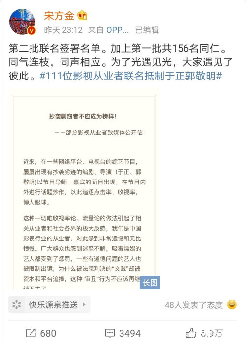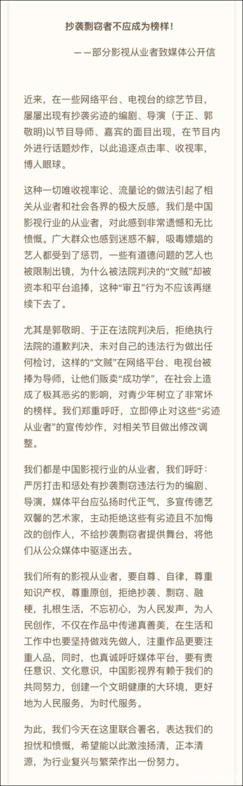 公開信呼籲:嚴厲打擊和懲處有抄襲剽竊違法行為的編劇、導演,媒體平台要有責任意識和文化意識,積極弘揚時代正氣,多多宣傳德藝雙馨的藝術家,主動拒絕有劣跡且不加悔改的創作人,不給抄襲剽竊者提供舞台,正本清源,為行業復興與繁榮共同努力。