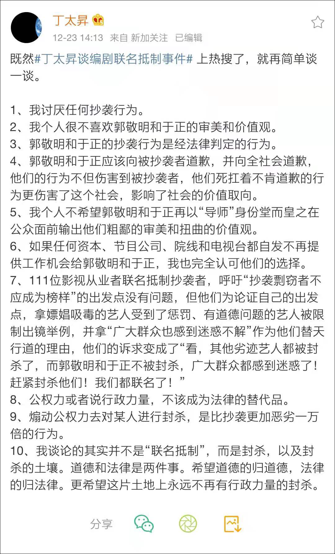 12月23日下午14:13,在“煽動大眾,並試圖煽動公權力進行封殺,比抄襲的行為更惡劣”的言論引起網絡熱議後,丁太升再度發文,闡述自己的觀點。