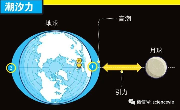 當地球某一部分轉到正對月球的位置時1 ,海平面升高,形成高潮。同時,另一頭海域2 的海平面也上升了:離月球最遠的這片海域受到的月球引力弱於轉動着的地球固態部分賦予的慣性力,宛如被“甩尾”。