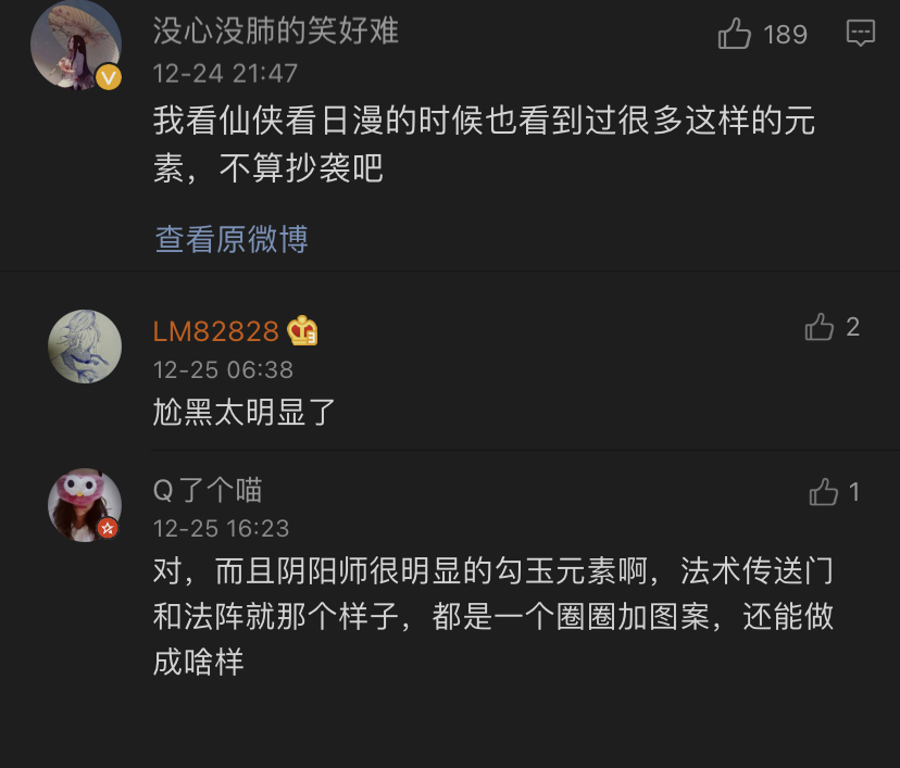 有關該法陣是否抄襲,社交媒體上的意見存在很大分歧。有網友認為,圓形法陣的概念在很多作品中早就存在。而“寫輪眼”中的勾玉圖案對於陰陽師來説更是常見。