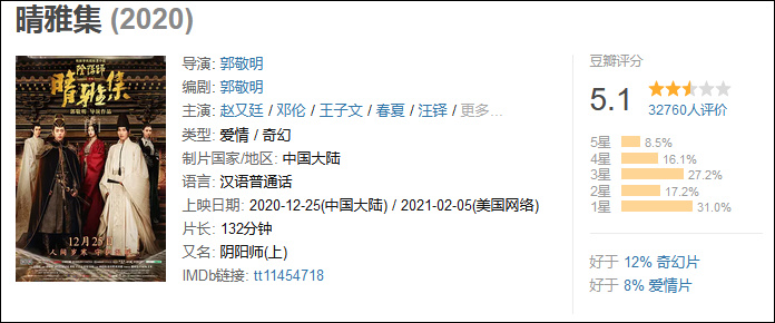 雖然票房很快破億,但《晴雅集》的在豆瓣電影上的評分卻並不“漂亮”,持續下跌之後,目前的評分為5.1分。