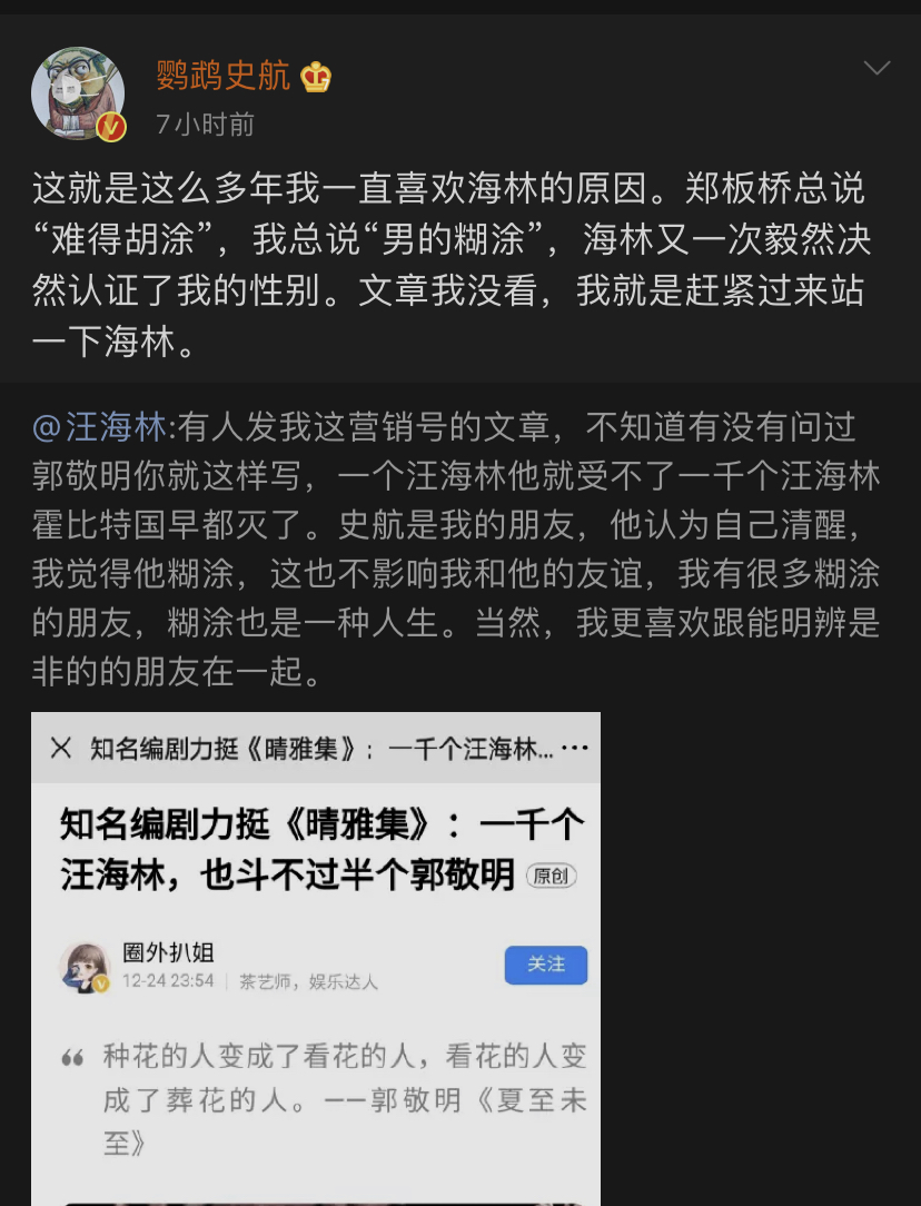 汪海林立刻予以回應稱,“史航是我的朋友,他認為自己清醒,我覺得他糊塗,這不影響我和他的友誼。”