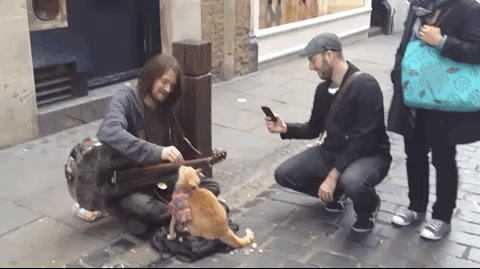 詹姆斯帶着鮑勃在街頭賣唱(上:電影/下:現實)