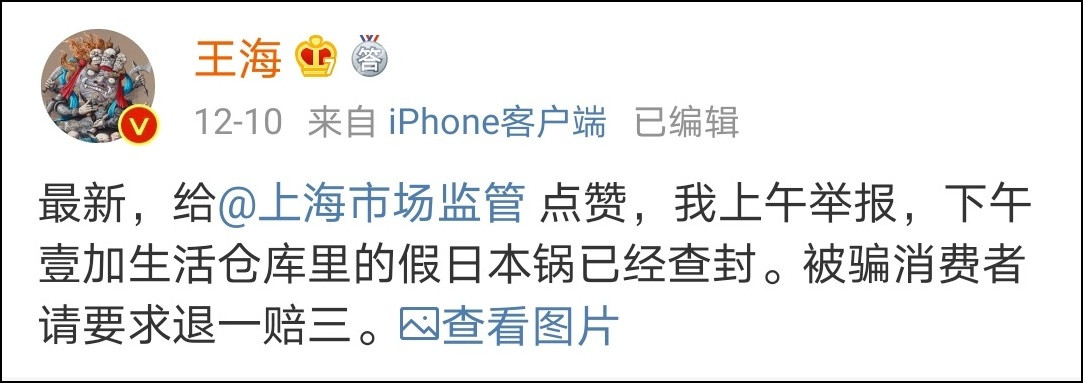 據王海介紹,在自己爆料的當天下午,電商平台已經對涉事商家予以關停,市場監管部門也對商家倉庫中的假日本鍋進行了查封。
