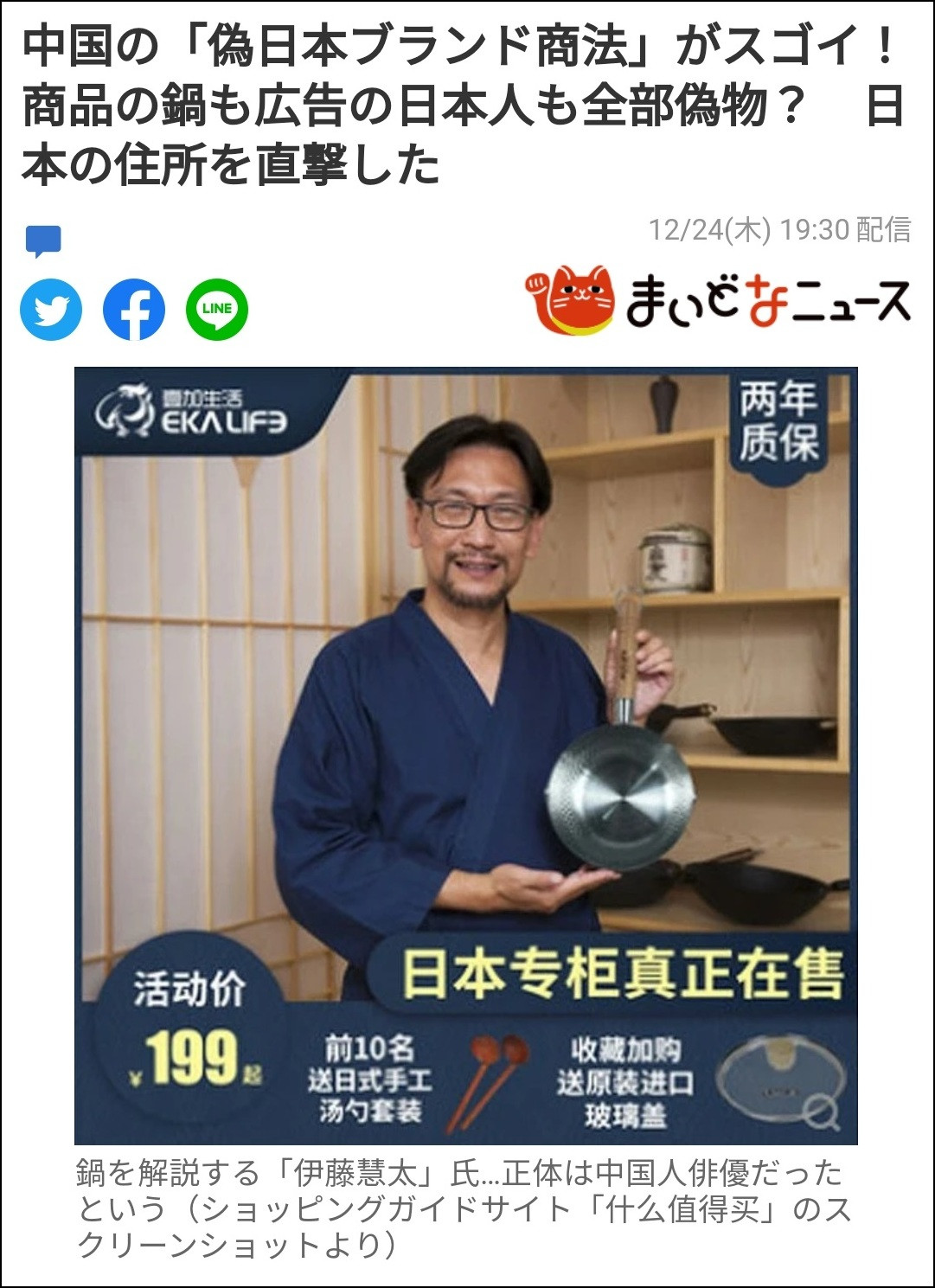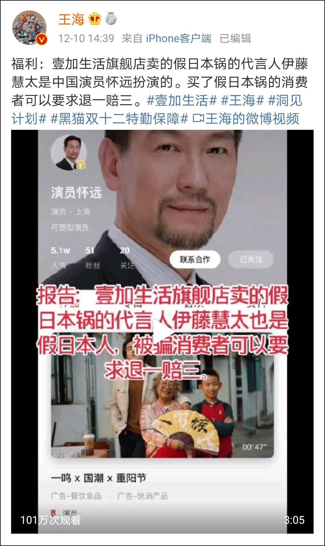 可能是基於此,這名中國演員在為假日本鍋站台時,才能夠操着一口足以糊弄中國消費者的日本話,説着“古法手工制鍋,百年技藝傳承……這是一種匠心的傳承”類似的廣告語。