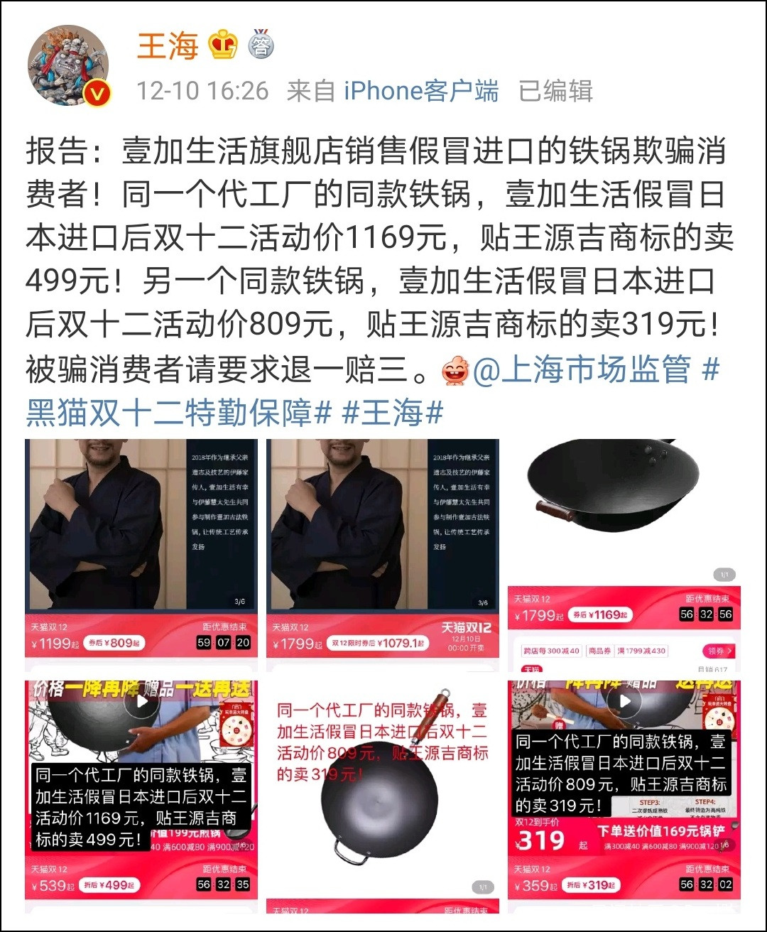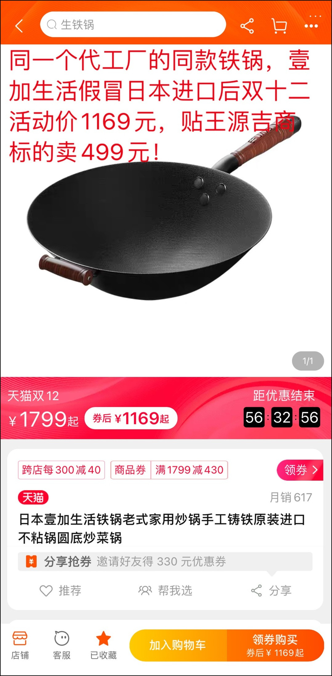 根據王海的爆料,同一個代工廠生產出來的同一款鐵鍋,貼國內品牌的商標售價300元-500元不等,但是假冒為日本進口後,鐵鍋的售價直接飆漲到1169元,而且這個價格還是雙十二期間的活動價,原價其實高達1799元。