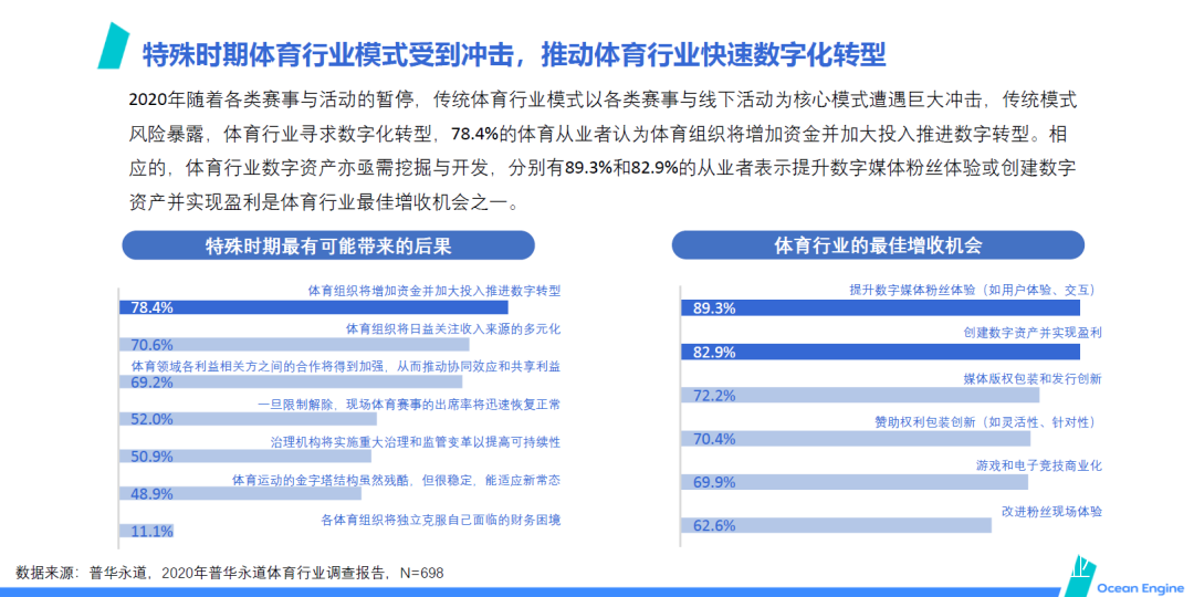 統計數據表明,78.4%的體育從業者認為體育組織將增加資金並加大投入推進數字轉型。相應的,體育行業數字資產也亟需挖掘與開發,分別有89.3%和82.9%的從業者表示提升數字媒體粉絲體驗或創建數字資產並實現盈利是體育行業最佳增收機會。