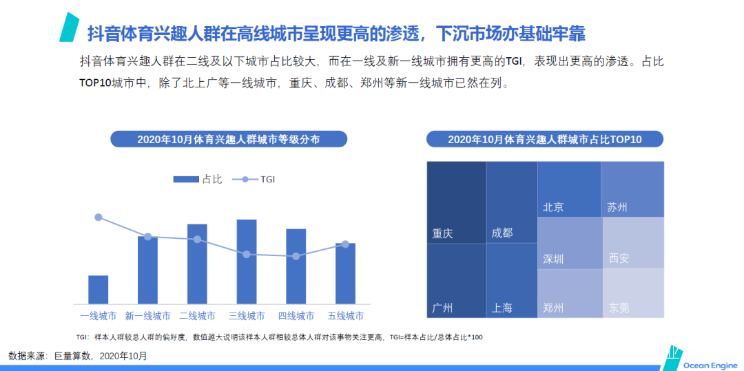 白皮書中指出,抖音體育興趣人羣在二線及以下城市佔比較大,而在一線及新一線城市擁有更高的TGI,表現出更高的滲透。佔比 TOP10城市中,除了北上廣等一線城市,重慶、成都、鄭州等新一線城市已然在列。