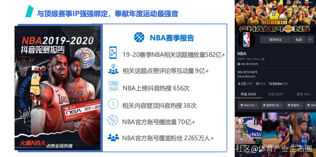 我們注意到,過去的一個賽季裏,NBA與抖音的合作也在不斷取得重要的突破。利用抖音的平台優勢,NBA在抖音站內不斷擴大着賽事粉絲羣體。數據顯示,NBA相關話題播放量達到582億+,相關點贊評論等互動量超過9億,官方賬號播放量已經超過70億,覆蓋粉絲近2300萬人次。